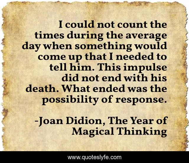 This page presents the quote "I could not count the times during the average day when something would come up that I needed to tell him. This impulse did not end with his death. What ended was the possibility of response.". Author of this quote is Joan Didion, The Year of Magical Thinking. This quote is about need, marriage,.
