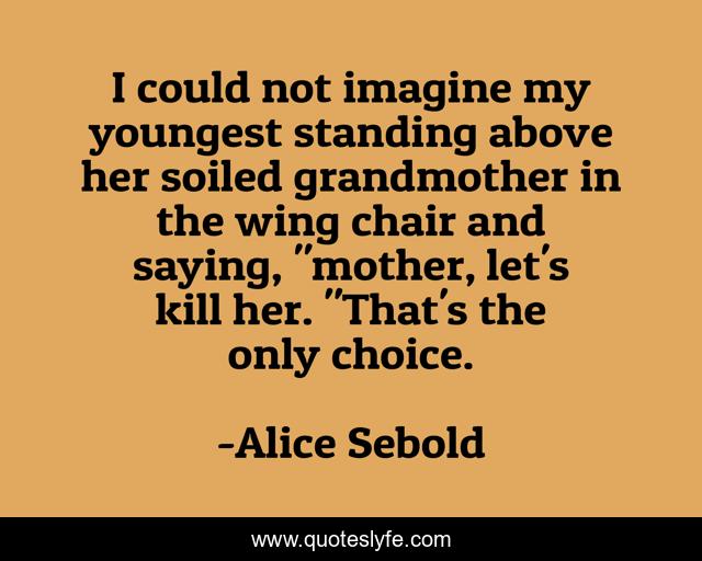 This page presents the quote "I could not imagine my youngest standing above her soiled grandmother in the wing chair and saying, "mother, let's kill her. "That's the only choice.". Author of this quote is Alice Sebold. .
