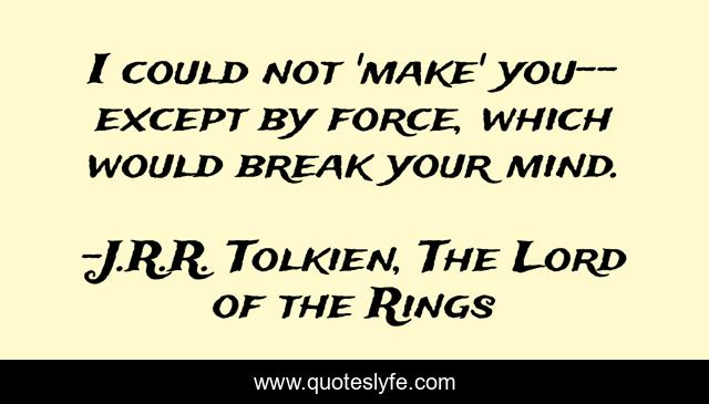 This page presents the quote "I could not 'make' you--except by force, which would break your mind.". Author of this quote is J.R.R. Tolkien, The Lord of the Rings. This quote is about free-will, force,.