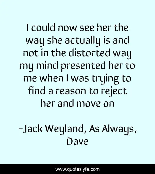 This page presents the quote "I could now see her the way she actually is and not in the distorted way my mind presented her to me when I was trying to find a reason to reject her and move on". Author of this quote is Jack Weyland, As Always, Dave. This quote is about relationships, perceptions, love, affection,.