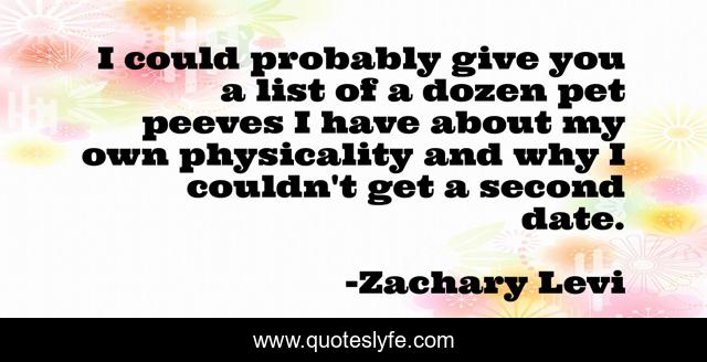 This page presents the quote "I could probably give you a list of a dozen pet peeves I have about my own physicality and why I couldn't get a second date.". Author of this quote is Zachary Levi. This quote is about my own, why,.