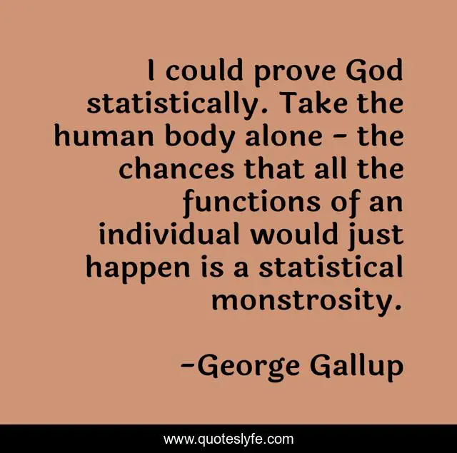 This page presents the quote "I could prove God statistically. Take the human body alone - the chances that all the functions of an individual would just happen is a statistical monstrosity.". Author of this quote is George Gallup. This quote is about body, god, human,.
