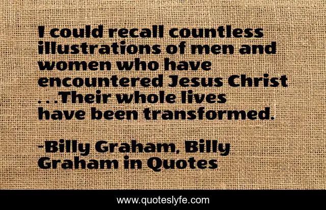 This page presents the quote "I could recall countless illustrations of men and women who have encountered Jesus Christ . . .Their whole lives have been transformed.". Author of this quote is Billy Graham, Billy Graham in Quotes. This quote is about life, billy-graham,.