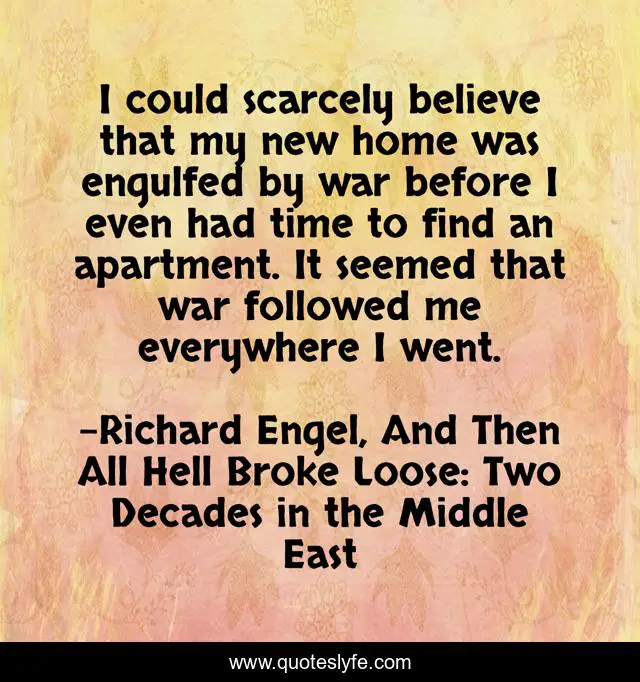 This page presents the quote "I could scarcely believe that my new home was engulfed by war before I even had time to find an apartment. It seemed that war followed me everywhere I went.". Author of this quote is Richard Engel, And Then All Hell Broke Loose: Two Decades in the Middle East. This quote is about war-correspondent, journalism,.