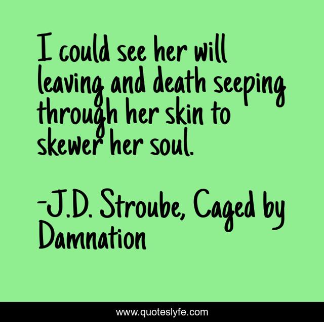 This page presents the quote "I could see her will leaving and death seeping through her skin to skewer her soul.". Author of this quote is J.D. Stroube, Caged by Damnation. This quote is about dark, skewer, paranormal, willpower, soul,.