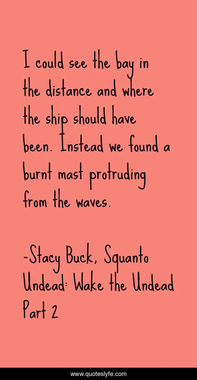 This page presents the quote "I could see the bay in the distance and where the ship should have been. Instead we found a burnt mast protruding from the waves.". Author of this quote is Stacy Buck, Squanto Undead: Wake the Undead Part 2. This quote is about undead-thriller, zombie-horror, squanto, action-adventure, native-american, zombies,.