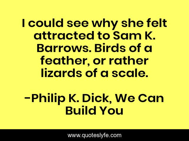 This page presents the quote "I could see why she felt attracted to Sam K. Barrows. Birds of a feather, or rather lizards of a scale.". Author of this quote is Philip K. Dick, We Can Build You. This quote is about witty, quip,.
