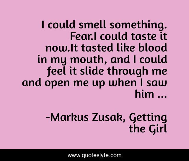 This page presents the quote "I could smell something. Fear.I could taste it now.It tasted like blood in my mouth, and I could feel it slide through me and open me up when I saw him ...". Author of this quote is Markus Zusak, Getting the Girl. This quote is about taste, mouth, fear, smell, blood,.