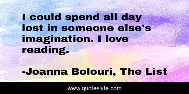 This page presents the quote "I could spend all day lost in someone else's imagination. I love reading.". Author of this quote is Joanna Bolouri, The List. This quote is about imagination, reading,.