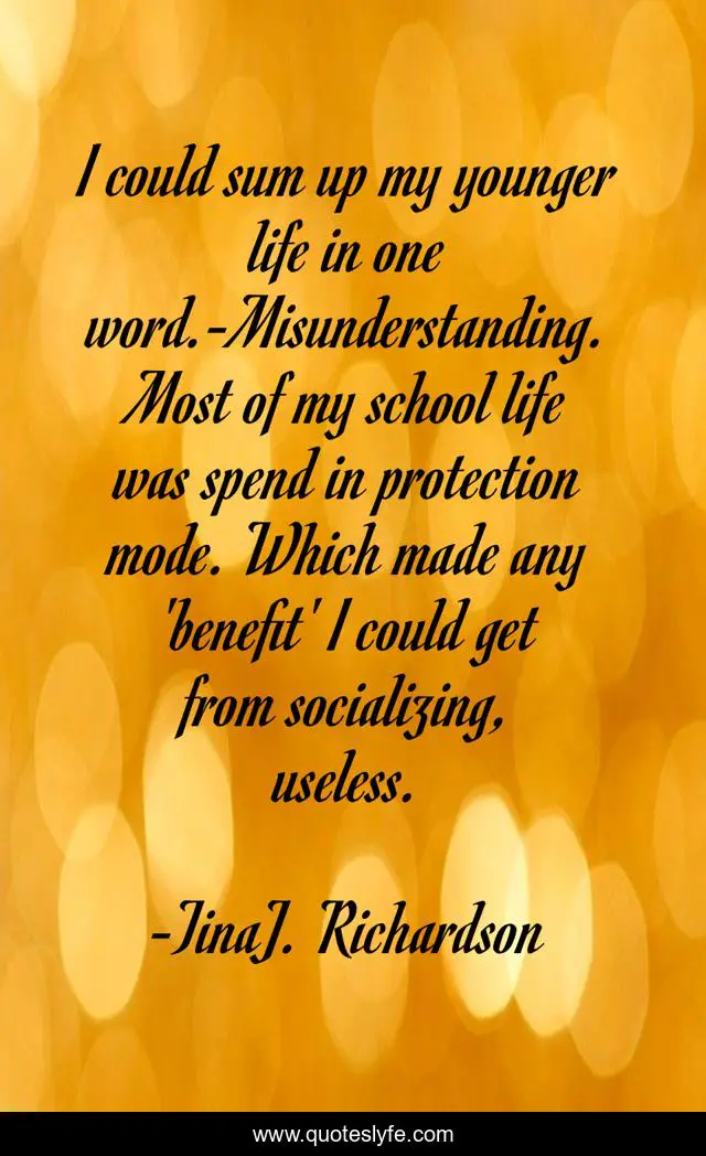 This page presents the quote "I could sum up my younger life in one word.-Misunderstanding. Most of my school life was spend in protection mode. Which made any 'benefit' I could get from socializing, useless.". Author of this quote is TinaJ. Richardson. This quote is about school, autism, childhood,.