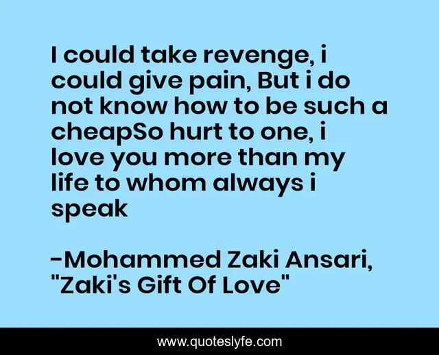 This page presents the quote "I could take revenge, i could give pain, But i do not know how to be such a cheapSo hurt to one, i love you more than my life to whom always i speak". Author of this quote is Mohammed Zaki Ansari, "Zaki's Gift Of Love". This quote is about love, human, affection, hurt,.
