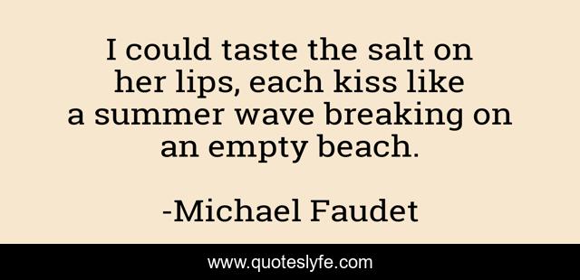 This page presents the quote "I could taste the salt on her lips, each kiss like a summer wave breaking on an empty beach.". Author of this quote is Michael Faudet. This quote is about lust, summer, love, affection, inspiration,.