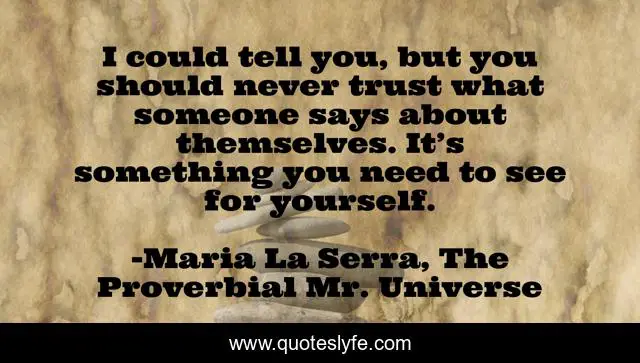 This page presents the quote "I could tell you, but you should never trust what someone says about themselves. It’s something you need to see for yourself.". Author of this quote is Maria La Serra, The Proverbial Mr. Universe. This quote is about relationships, love, love-and-sayings, relationship-advice, love-story, trust, affection,.