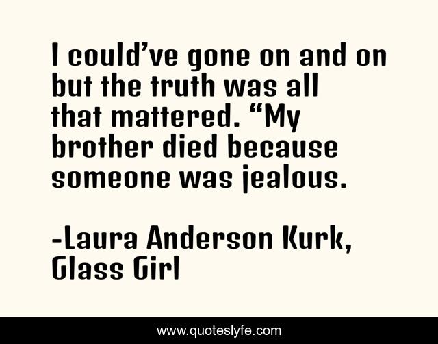 This page presents the quote "I could’ve gone on and on but the truth was all that mattered. “My brother died because someone was jealous.". Author of this quote is Laura Anderson Kurk, Glass Girl. This quote is about glass-girl, laura-anderson-kurk, teen-fiction, meg-kavanagh, gun-violence, ya-fiction, young-adult-fiction, school-shooting,.