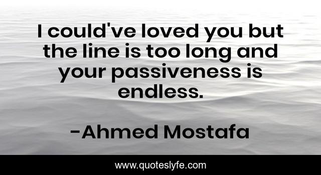 This page presents the quote "I could've loved you but the line is too long and your passiveness is endless.". Author of this quote is Ahmed Mostafa. This quote is about impatient, do-something, impatience, lost-love, passive, too-long, alas, love, endless,.
