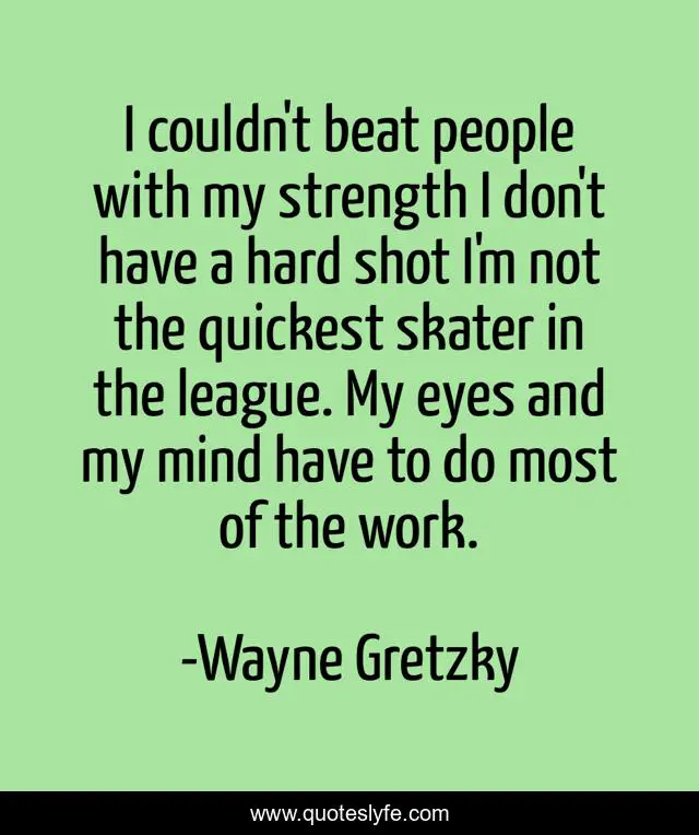 This page presents the quote "I couldn't beat people with my strength I don't have a hard shot I'm not the quickest skater in the league. My eyes and my mind have to do most of the work.". Author of this quote is Wayne Gretzky. This quote is about eyes, work, mind,.