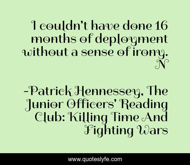 This page presents the quote "I couldn't have done 16 months of deployment without a sense of irony. N". Author of this quote is Patrick Hennessey, The Junior Officers' Reading Club: Killing Time And Fighting Wars. This quote is about humor, perspective,.