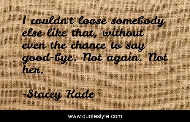 This page presents the quote "I couldn't loose somebody else like that, without even the chance to say good-bye. Not again. Not her.". Author of this quote is Stacey Kade. This quote is about body, ghost, goth, kade, soul, stacey,.