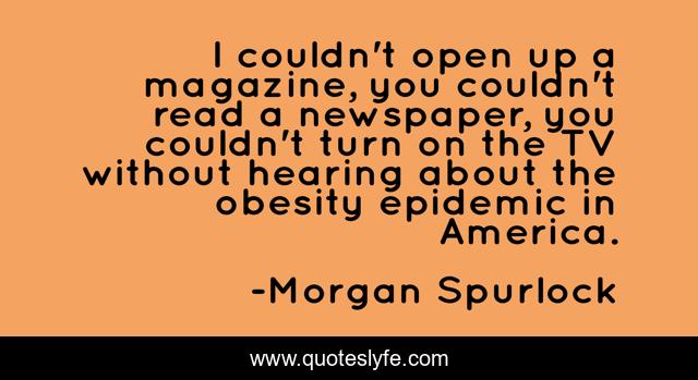 This page presents the quote "I couldn't open up a magazine, you couldn't read a newspaper, you couldn't turn on the TV without hearing about the obesity epidemic in America.". Author of this quote is Morgan Spurlock. This quote is about non-fiction, america, obesity-epidemic, fast-food, don-t-eat-this-book, morgan-spurlock, mcdonald-s,.