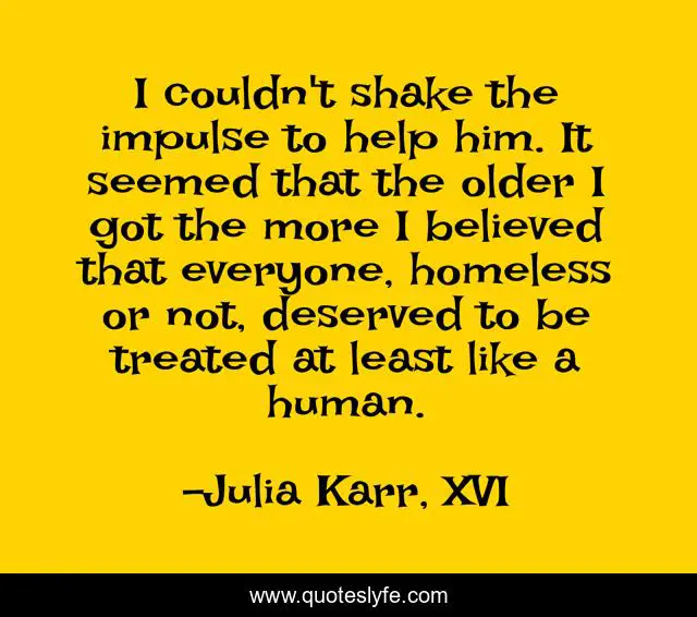 This page presents the quote "I couldn't shake the impulse to help him. It seemed that the older I got the more I believed that everyone, homeless or not, deserved to be treated at least like a human.". Author of this quote is Julia Karr, XVI. This quote is about maturity, kindness,.