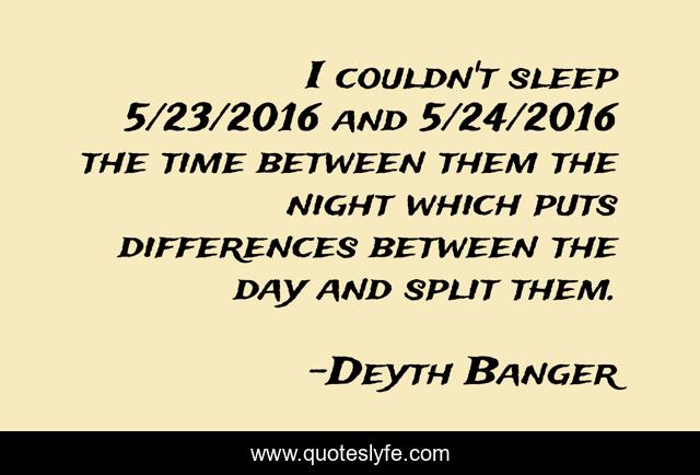 This page presents the quote "I couldn't sleep 5/23/2016 and 5/24/2016 the time between them the night which puts differences between the day and split them.". Author of this quote is Deyth Banger. This quote is about i, between, couldn-t, sleep, night, put,.