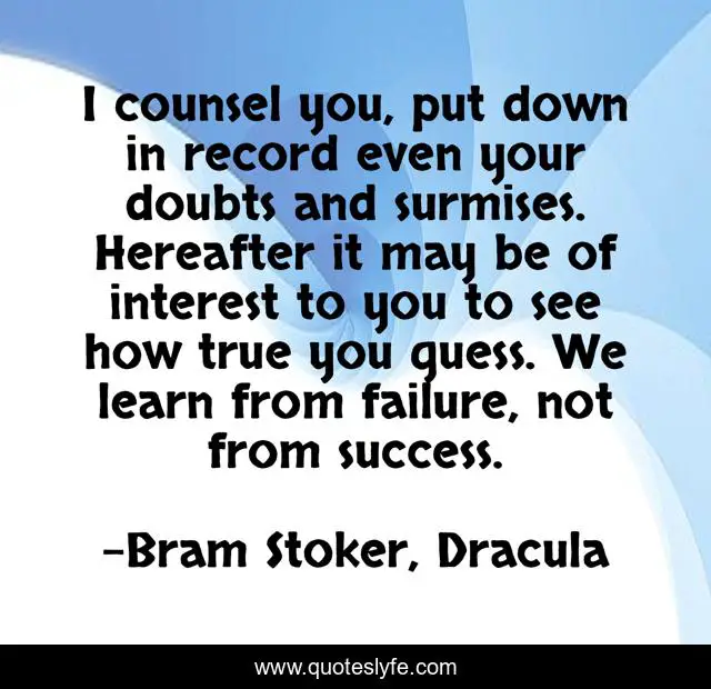 This page presents the quote "I counsel you, put down in record even your doubts and surmises. Hereafter it may be of interest to you to see how true you guess. We learn from failure, not from success.". Author of this quote is Bram Stoker, Dracula. This quote is about failure, van-helsing, success, doubts,.