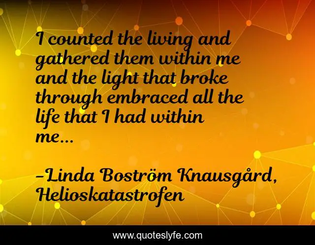 This page presents the quote "I counted the living and gathered them within me and the light that broke through embraced all the life that I had within me...". Author of this quote is Linda Boström Knausgård, Helioskatastrofen. This quote is about life, strength, love, light, hope, affection,.