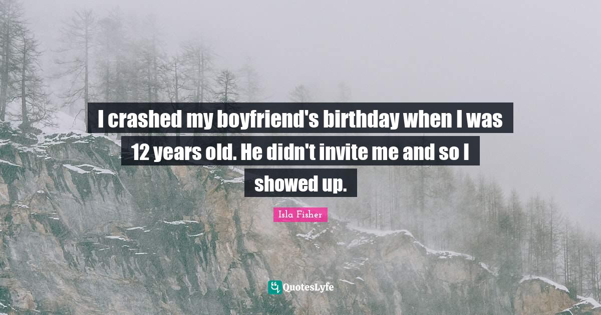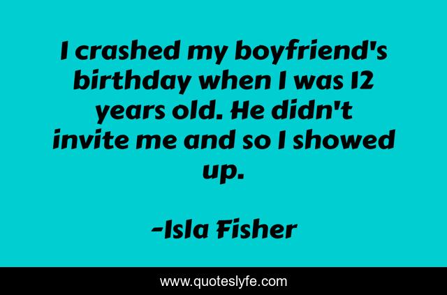 This page presents the quote "I crashed my boyfriend's birthday when I was 12 years old. He didn't invite me and so I showed up.". Author of this quote is Isla Fisher. This quote is about me, up, years,.