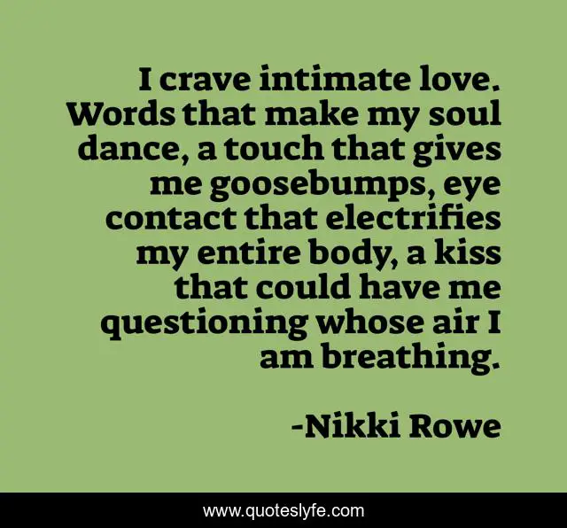 This page presents the quote "I crave intimate love. Words that make my soul dance, a touch that gives me goosebumps, eye contact that electrifies my entire body, a kiss that could have me questioning whose air I am breathing.". Author of this quote is Nikki Rowe. This quote is about true-love, two-soul, destiny, twin-flame-love, fate, magical, depth, love-story, twinflame,.