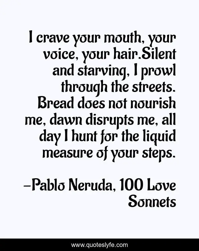 This page presents the quote "I crave your mouth, your voice, your hair.Silent and starving, I prowl through the streets. Bread does not nourish me, dawn disrupts me, all day I hunt for the liquid measure of your steps.". Author of this quote is Pablo Neruda, 100 Love Sonnets. This quote is about love, sonnet-xi, passion, poetry, affection,.