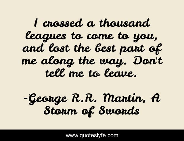 This page presents the quote "I crossed a thousand leagues to come to you, and lost the best part of me along the way. Don't tell me to leave.". Author of this quote is George R.R. Martin, A Storm of Swords. This quote is about romance, jaime-lannister, love, affection,.