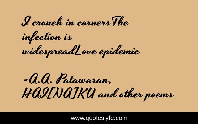 This page presents the quote "I crouch in cornersThe infection is widespreadLove epidemic". Author of this quote is A.A. Patawaran, HAI[NA]KU and other poems. This quote is about love, poetry, affection, haiku,.
