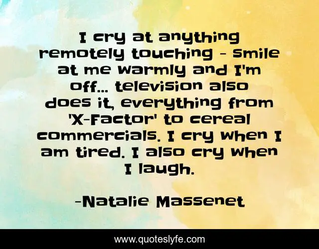 This page presents the quote "I cry at anything remotely touching - smile at me warmly and I'm off... television also does it, everything from 'X-Factor' to cereal commercials. I cry when I am tired. I also cry when I laugh.". Author of this quote is Natalie Massenet. This quote is about me, tired,.