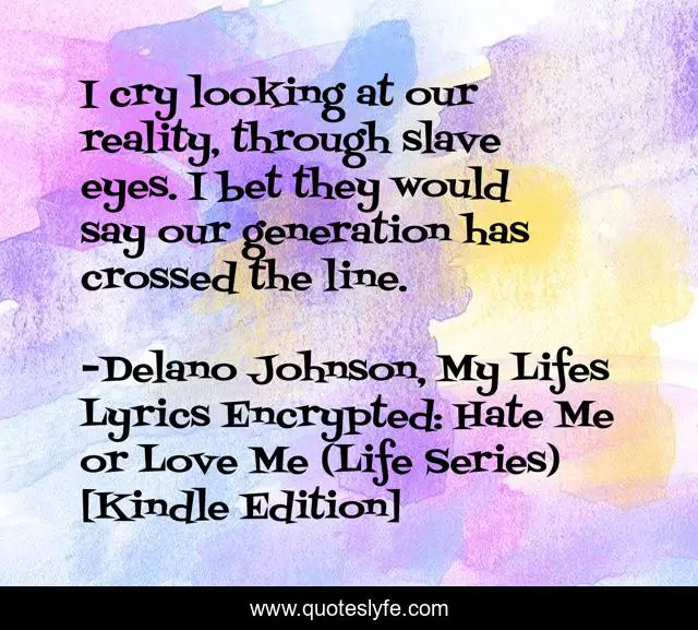 This page presents the quote "I cry looking at our reality, through slave eyes. I bet they would say our generation has crossed the line.". Author of this quote is Delano Johnson, My Lifes Lyrics Encrypted: Hate Me or Love Me (Life Series) [Kindle Edition]. This quote is about generation, callie-johnson, delano-johnson, slaves, reality,.