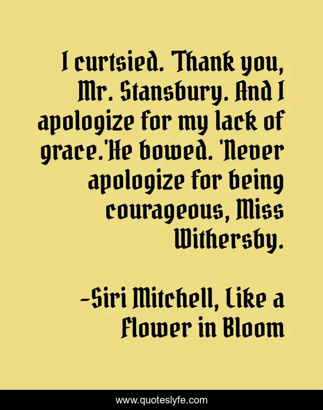"Siri Mitchell, Like a Flower in Bloom Quotes." Quoteslyfe.com, 2025. Sat. 06 Dec. 2025. <https://www.quoteslyfe.com/quote/I-curtsied-Thank-you-Mr-Stansbury-And-91575>.