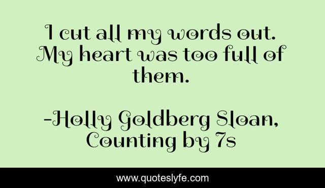 This page presents the quote "I cut all my words out. My heart was too full of them.". Author of this quote is Holly Goldberg Sloan, Counting by 7s. This quote is about emotion, loss, non-verbal, overwhelmed,.