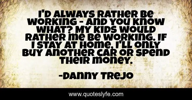 This page presents the quote "I'd always rather be working - and you know what? My kids would rather me be working. If I stay at home, I'll only buy another car or spend their money.". Author of this quote is Danny Trejo. This quote is about me, home, money,.