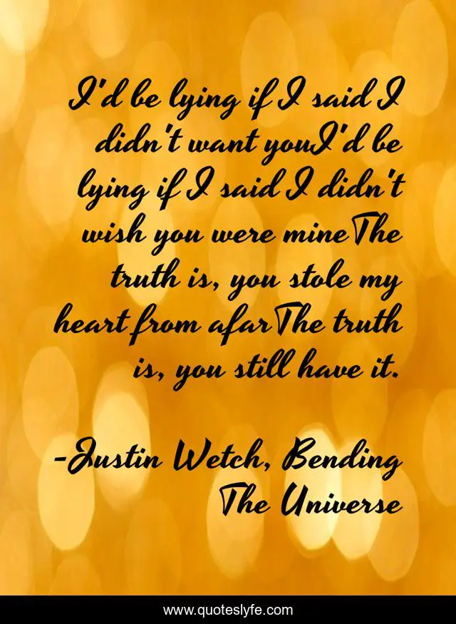 This page presents the quote "I'd be lying if I said I didn't want youI'd be lying if I said I didn't wish you were mineThe truth is, you stole my heart from afarThe truth is, you still have it.". Author of this quote is Justin Wetch, Bending The Universe. This quote is about broken-heart, romance, heartbreak, love, affection,.