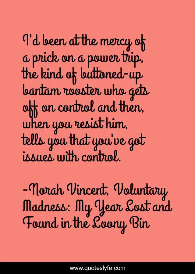This page presents the quote "I'd been at the mercy of a prick on a power trip, the kind of buttoned-up bantam rooster who gets off on control and then, when you resist him, tells you that you've got issues with control.". Author of this quote is Norah Vincent, Voluntary Madness: My Year Lost and Found in the Loony Bin. This quote is about control, relationships, power, idiocy, men, jerks, society, fools, women-and-men,.