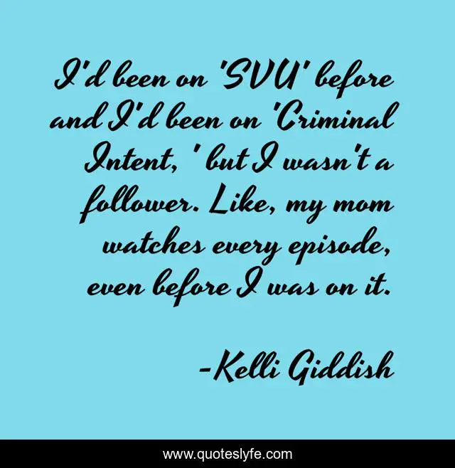 This page presents the quote "I'd been on 'SVU' before and I'd been on 'Criminal Intent, ' but I wasn't a follower. Like, my mom watches every episode, even before I was on it.". Author of this quote is Kelli Giddish. This quote is about intent, like, watches,.