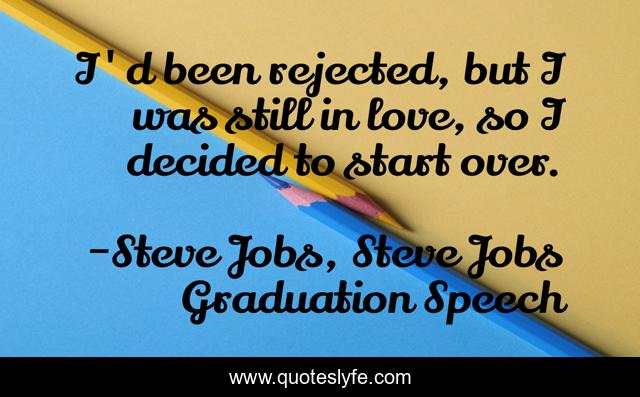 This page presents the quote "I'd been rejected, but I was still in love, so I decided to start over.". Author of this quote is Steve Jobs, Steve Jobs Graduation Speech. This quote is about steve-jobs, rejection, start-over, speech, inspirational, enthusiasm,.