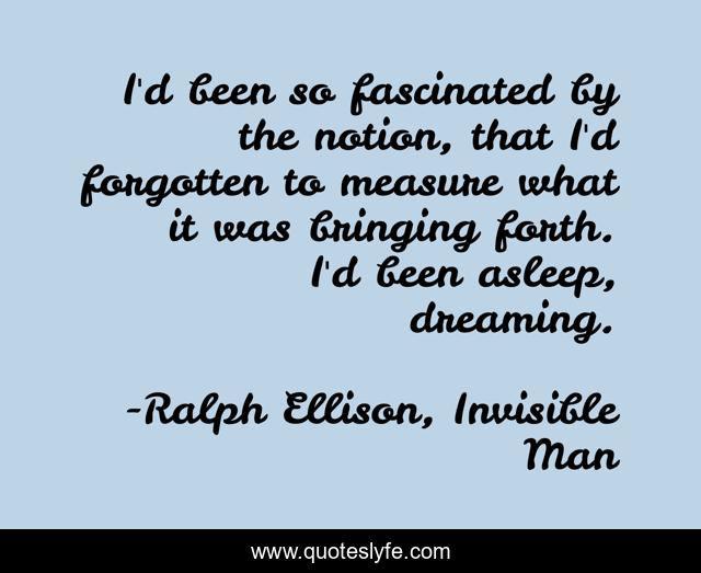 This page presents the quote "I'd been so fascinated by the notion, that I'd forgotten to measure what it was bringing forth. I'd been asleep, dreaming.". Author of this quote is Ralph Ellison, Invisible Man. .