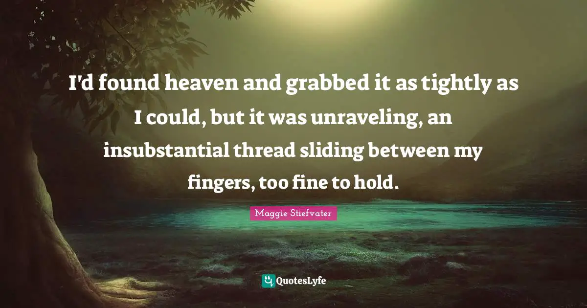 This page presents the quote "I'd found heaven and grabbed it as tightly as I could, but it was unraveling, an insubstantial thread sliding between my fingers, too fine to hold.". Author of this quote is Maggie Stiefvater. This quote is about fingers, thread, fine, found, unraveling, heaven,.