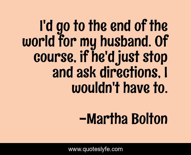 This page presents the quote "I'd go to the end of the world for my husband. Of course, if he'd just stop and ask directions, I wouldn't have to.". Author of this quote is Martha Bolton. This quote is about humor, marriage,.