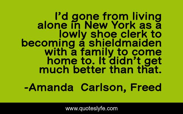 This page presents the quote "I’d gone from living alone in New York as a lowly shoe clerk to becoming a shieldmaiden with a family to come home to. It didn’t get much better than that.". Author of this quote is Amanda Carlson, Freed. This quote is about fen, paranormal-urban-fantasy, valkyries, mythology, odin, norns,.