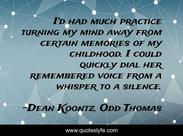 This page presents the quote "I'd had much practice turning my mind away from certain memories of my childhood. I could quickly dial her remembered voice from a whisper to a silence.". Author of this quote is Dean Koontz, Odd Thomas. This quote is about memories, practice, silence, mother, voice, childhood, odd-thomas,.