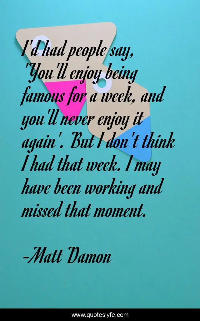 This page presents the quote "I'd had people say, 'You'll enjoy being famous for a week, and you'll never enjoy it again'. But I don't think I had that week. I may have been working and missed that moment.". Author of this quote is Matt Damon. This quote is about week, enjoy, moment,.