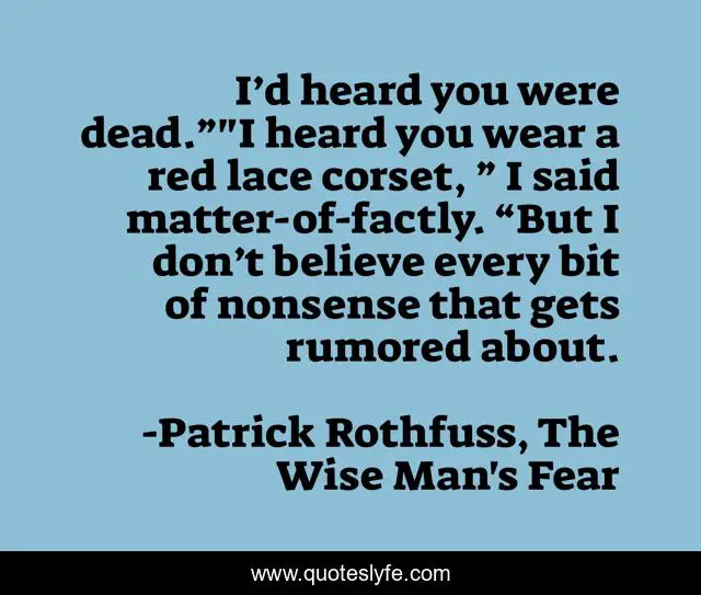 This page presents the quote "I’d heard you were dead.”"I heard you wear a red lace corset, ” I said matter-of-factly. “But I don’t believe every bit of nonsense that gets rumored about.". Author of this quote is Patrick Rothfuss, The Wise Man's Fear. This quote is about witty, humor, put-downs, rumors, insults,.