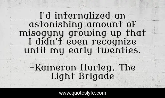This page presents the quote "I'd internalized an astonishing amount of misogyny growing up that I didn't even recognize until my early twenties.". Author of this quote is Kameron Hurley, The Light Brigade. This quote is about revolution, geek-feminist,.