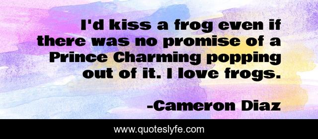 This page presents the quote "I'd kiss a frog even if there was no promise of a Prince Charming popping out of it. I love frogs.". Author of this quote is Cameron Diaz. This quote is about love, kiss, affection, charming,.